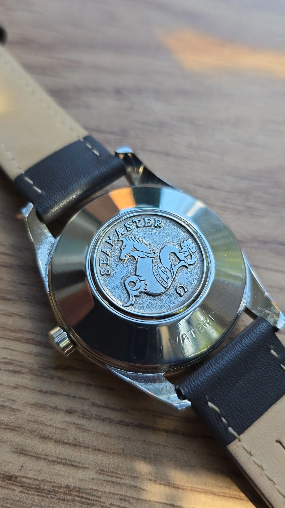 The 1958 Omega Seamaster 2975-1 features a 35mm stainless steel case paired with a rare "Big Logo" sea monster caseback, making it a standout collector’s piece. Its graphite dial combines elegance with distinctive vintage charm, complemented by a premium grey leather strap for refined comfort. Powered by the trusted caliber 501 automatic movement, this watch offers both historical significance and reliable performance. Presented in its original Omega box, this Seamaster is a sophisticated choice for those who appreciate classic horology.