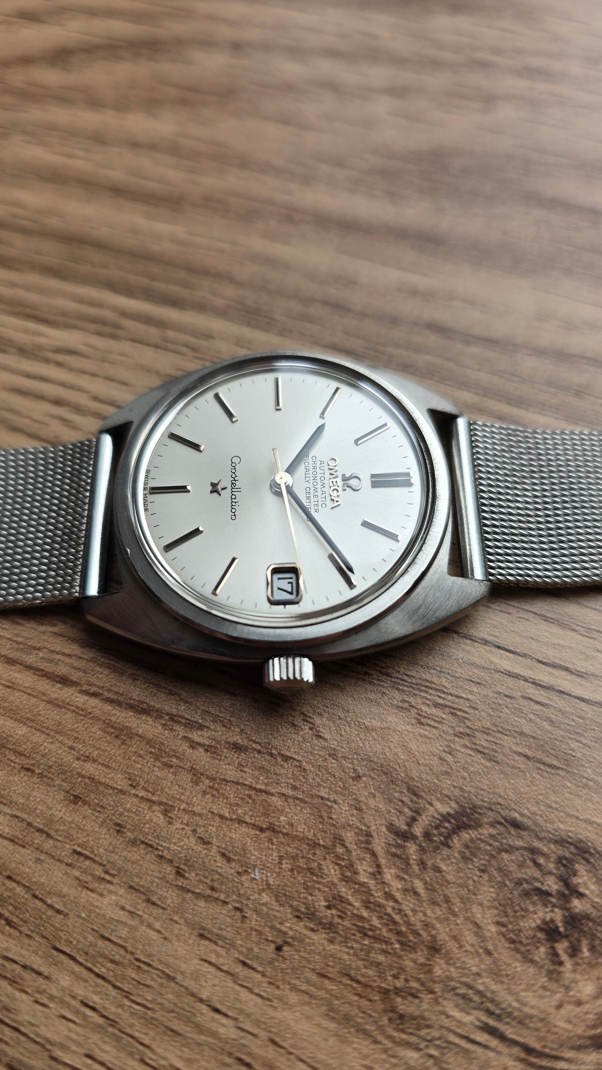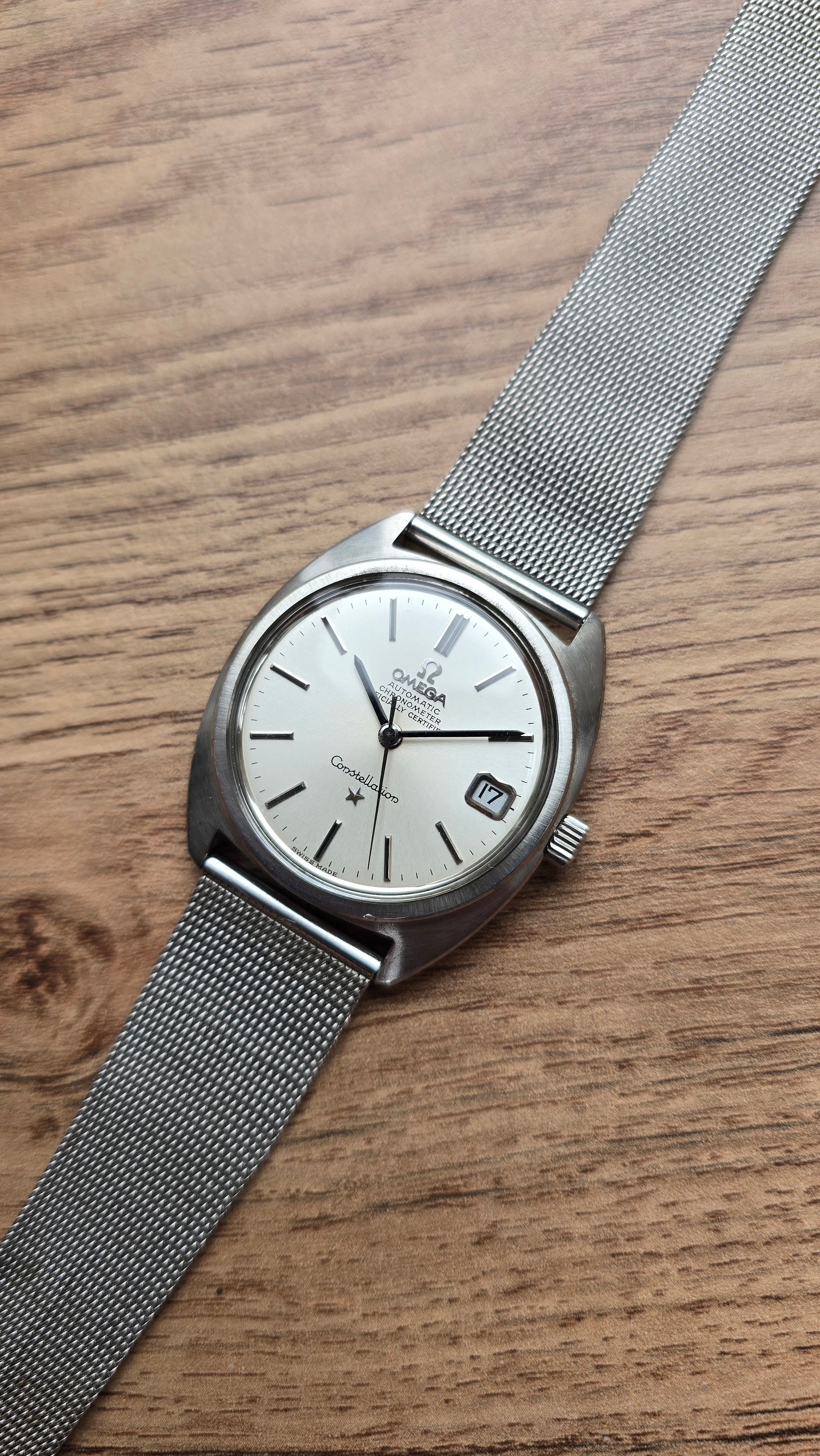 The 1970 Omega Constellation 168.017 features a 35.5mm stainless steel case with the iconic Observatory logo on the caseback, symbolizing precision and heritage. Its pearl white dial complements the Omega stainless steel mesh strap, creating a refined and timeless look. Powered by the automatic Caliber 564 movement, this watch offers reliable performance and smooth operation, making it a distinguished choice for collectors and enthusiasts seeking classic elegance with expert craftsmanship.