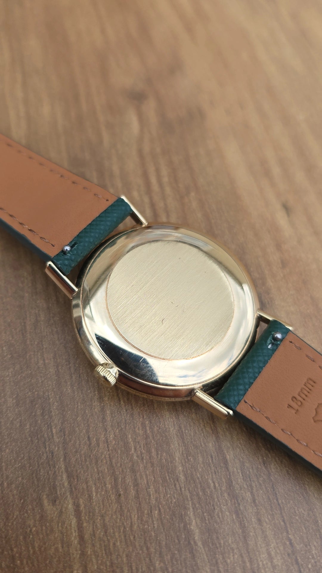 Exquisite 1972 Omega Geneve 135.011 showcasing a refined 9ct gold case and distinctive linen dial. This 34mm timepiece houses the precision manual wind 501 movement, a hallmark of Omega's horological expertise. Complemented by a premium green leather strap, this vintage masterpiece offers both historical significance and everyday wearability for the discerning collector.
