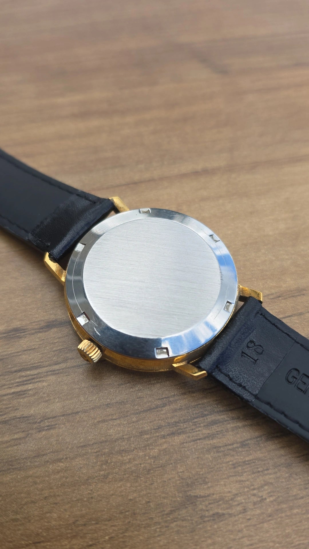 The 1973 Omega Geneve 166.763 boasts a premium black leather strap and an automatic 1012 movement. Its dark champagne dial and 35mm gold-plated case exude elegance and sophistication. For a timeless timepiece that offers both style and function, look no further than the 1973 Omega Geneve 166.763.