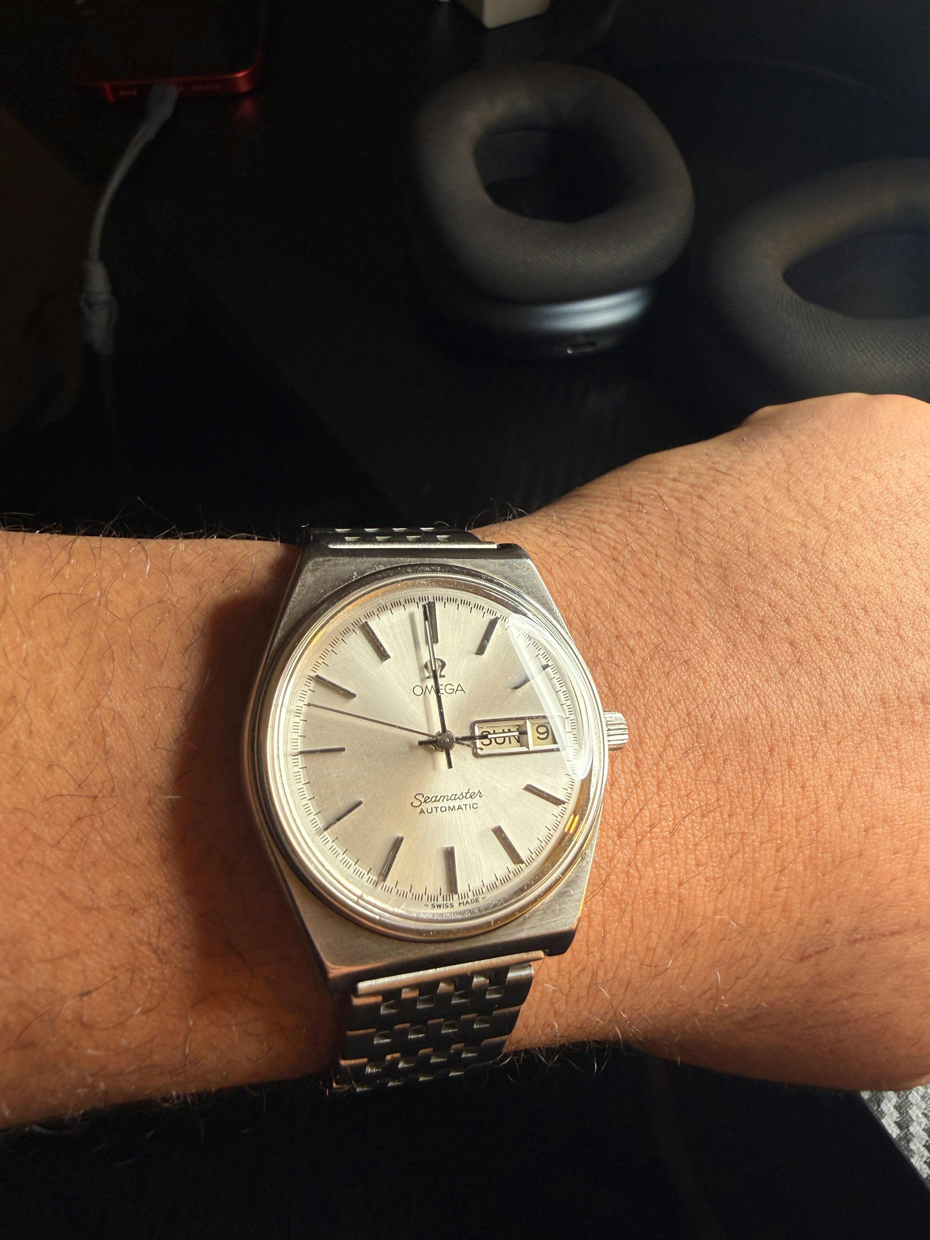 This exceptional 1979 Omega Seamaster 166.0210 represents a pinnacle of vintage horology. The platinum-coloured dial commands attention within its robust 35mm stainless steel case, whilst the distinctive Sea monster caseback adds character and authenticity. Fitted with the original Omega Tank Track bracelet, this timepiece maintains its period-correct specifications. The reliable automatic calibre 1020 movement ensures consistent timekeeping performance. A sophisticated acquisition for the discerning collector seeking genuine vintage Omega craftsmanship.